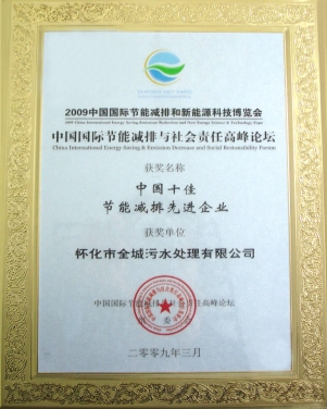 • 2009年3月在胡錦濤、溫家寶等中央領導出席的中國國際節(jié)能減排與新能源科技博覽會和高峰論壇上評為“中國十佳節(jié)能減排先進企業(yè)”。